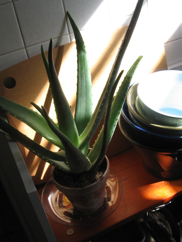 The common houseplant aloe vera has some extraordinary qualities that have made it very popular. Foremost are its medicinal uses. It is easily recognizable by its long, fleshy leaves growing in a rosette pattern. A succulent, it has a natural capacity for water storage and a shallow root system, making it the ideal house plant. Additionally this plant is very easy to take care of. These all makes aloe vera, a medicine plant, great to have in your kitchen